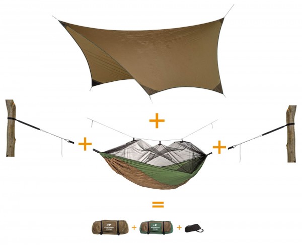1 "Adventure Moskito Hammock Thermo" hammock + 1 "Adventure Tarp" (incl. 4 Y-aluminium rings (+ approx. 60 grams)) + 1 "Adventure Rope" rope set (consisting of 2 hangers)