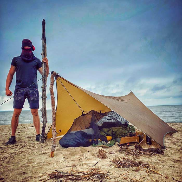 Auf seiner 1.500km Bike Tour von Berlin nach Estland hatte Fritz unter anderem unser ultraleichtes und kompaktes Tarp im Gepäck. Er benutzte es mit unserer Moskito-Hängematte einfach als Zeltersatz auf dem Boden. Bei so einem Ground Setup brauchst du nämlich nicht einmal Bäume um in einer Hängematte zu schlafen!