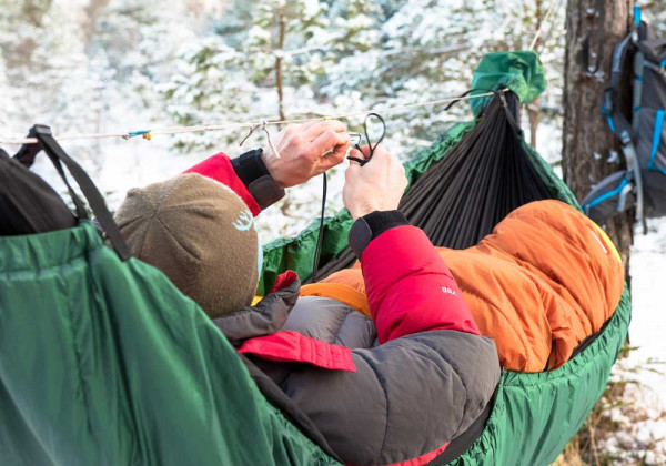 • Si vous utilisez un hamac Moskito avec une Ridgeline, le petit mousqueton vous permet de fixer les drisses de tension de l’underquilt en haut au niveau de la Ridgeline. Cela permet de remonter les côtés de l’underquilt et de vous protéger encore mieux du froid et du vent sur les côtés.
