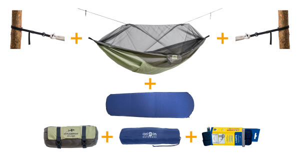 1 "Moskito-Traveller Thermo" Hängematte + 1 "selbstaufblasende Isomatte" (inkl. Verpackungsbeutel) + 1 "T-Strap" Seilset (bestehend aus 2 Aufhängungen)